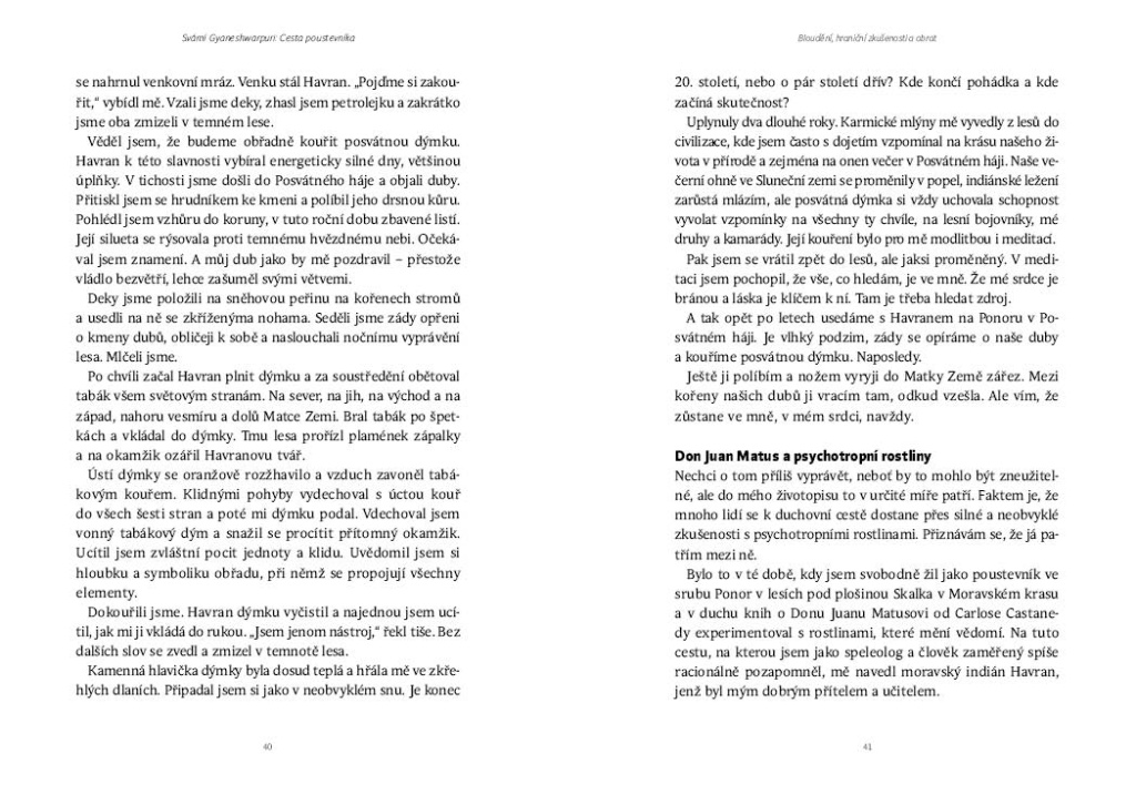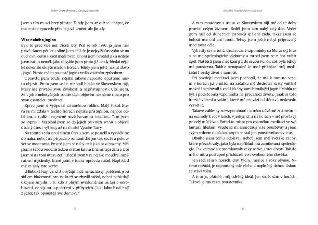 Co vede člověka k tomu, aby opustil běžný život a vydal se do lesů, hor, jeskyní a pousteven? Cesta poustevníka je osobním svědectvím Svámího Gyaneshwarpuri o duchovní cestě, která vedla od dětství v moravské krajině přes tramping, speleologii, samotu a hledání mistra až k vysvěcení na hinduistického a jógového mnicha. Kniha zachycuje desetiletí hledání, vnitřních zápasů, vztahů, odříkání i života v ústraní v Moravském krasu, Krkonoších, Slovenském ráji, rumunských Karpatech, horách nad Assisi a indickém Himálaji. Vznikl tak neobvyklý, místy syrový a niterný příběh člověka, který se rozhodl brát vážně volání k samotě, modlitbě a mnišství – a otevírá čtenáři svět, jenž dnes zůstává téměř neviditelný: svět poustevníka.